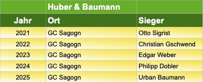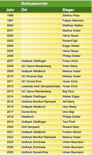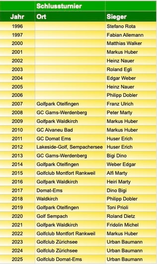 Das Schlussturnier findet jeweils im Oktober zum Abschluss der Golfsaison statt. Alle Mitglieder können teilnehmen, und alle haben eine realistische Chance, zu gewinnen oder sich in den vordersten Plätzen klassieren zu können. Wie die Siegerlisten der letzten Jahre beweisen, haben an diesen Tagen gerade die Newcomer den vermeintlich verschiedentlich gestandenen Routiniers gezeigt, wie man erfolgreich spielt.