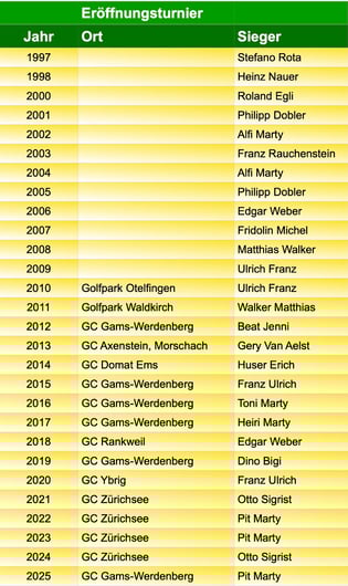 Das Eröffnungsturnier findet jeweils vor der GV im März oder April am Anfang der neuen Golfsaison statt. Alle Mitglieder können teilnehmen, und alle haben eine realistische Chance, zu gewinnen oder sich in den vordersten Plätzen klassieren zu können. Wie die Siegerlisten der letzten Jahre beweisen, haben an diesen Tagen Newcomer verschiedentlich gestandenen Routiniers gezeigt, wie man erfolgreich spielt.